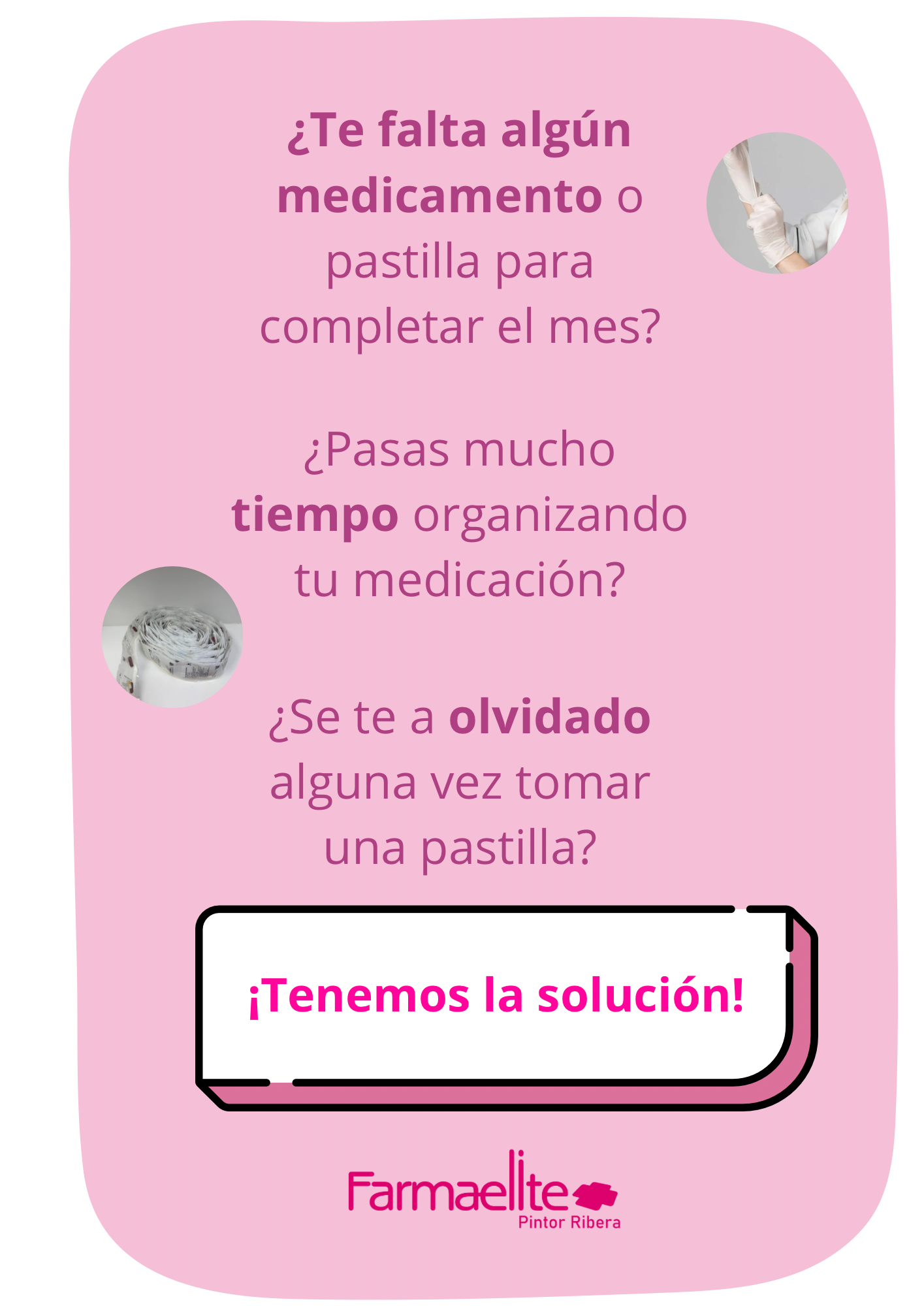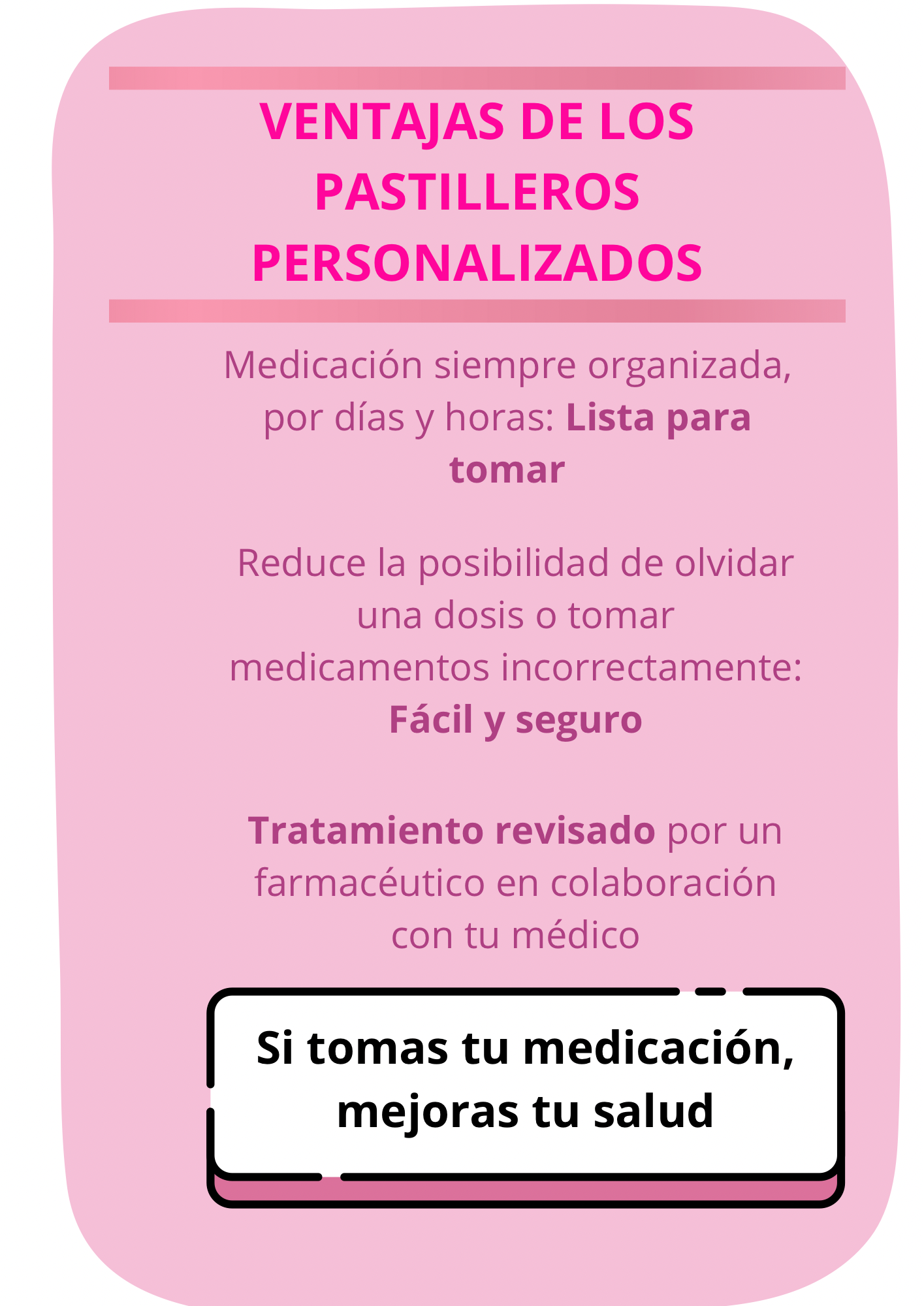 En la farmacia preparamos su medicación organizada por días y tomas, para que sepa exactamente qué pastillas tomar y cuándo. Bajo la supervisión de un farmacéutico
